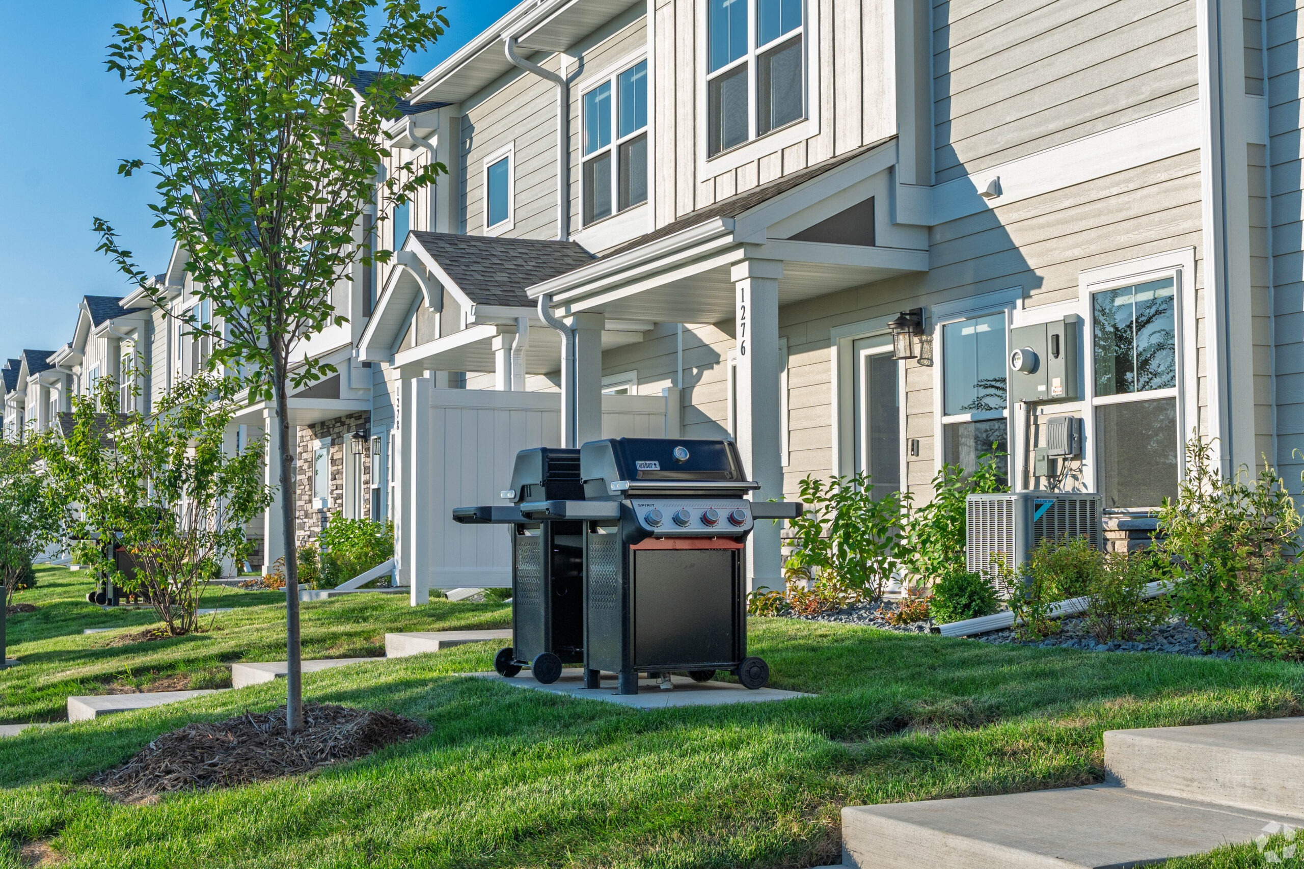Each townhome unit is thoughtfully designed with an attached two-car garage, a mechanical room, and ample storage. Inside, residents can enjoy a cozy living room featuring a built-in electric fireplace. The first level includes the main entry, kitchen, dining area, and a convenient half bathroom. The second level offers three-bedroom layouts with spacious closets, additional storage, a washer/dryer, and two full bathrooms. These homes are equipped with smart technology, including a video doorbell, keyless entry, a smart thermostat, and a garage door opener for modern, connected living.