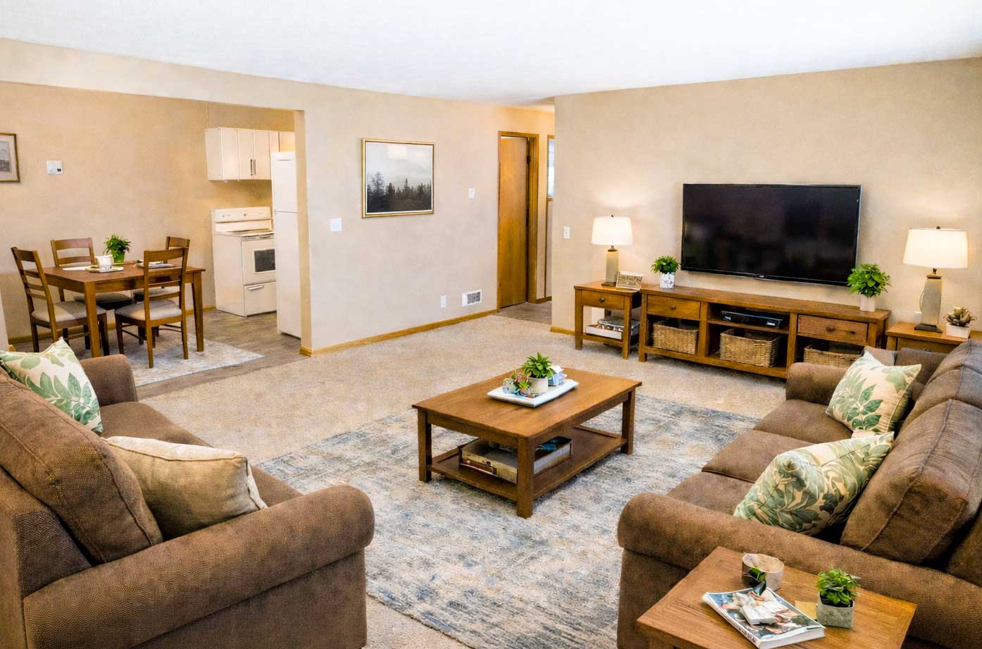 Our spacious two-bedroom units are designed with comfort and convenience in mind. Each home features one to two full bathrooms with a tub/shower, a well-appointed kitchen complete with a stove, refrigerator, and a huge living room perfect for relaxing or entertaining.